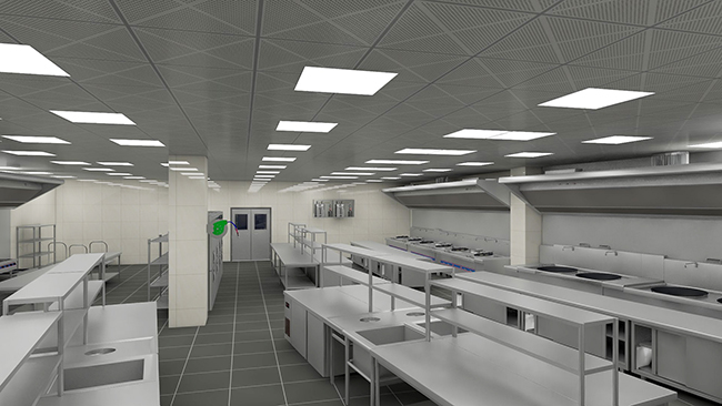 厨房照明系统器件单一,用电量比较小,但数量多,工作时间长,因此不能低估日积月累的能耗。在设计时要点位疏密合适,确保重点照度;采用高效低耗的节能光源;采取分路控制,非工作时间降低不必要的区域的照度;非主要通道采用光控方式控制开关时间;加装新型高效照明反射罩。在厨房布局设计时就要尽量利用自然光采光,可以节约大量能源。