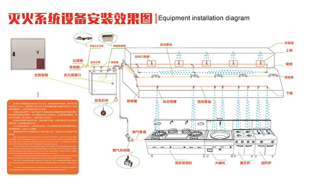消防灭火设施有多种技术设备,针对厨房火灾的特点,商用厨房灭火装置一般由火灾探测器、驱动器、启动钢瓶、灭火剂储存容器、喷嘴及自动执行机构与紧急手动装置组成。当系统探测器感测到危险信号,或手动应急装置启动,系统马上自动实施灭火、自动切断燃料供给、灭火后自动切换喷射冷却水进行冷却,防止复燃、冲洗管道等;还具有自动关闭风机、关闭火场中应该关闭的电源、自动输出信号至消防控制中心发出警报的功能,完成系统的整套灭火动作。