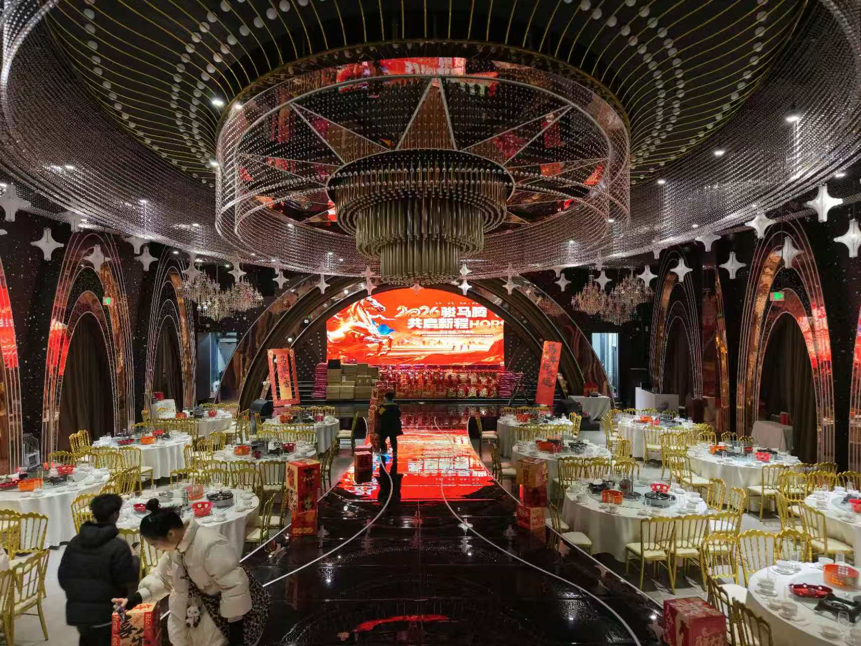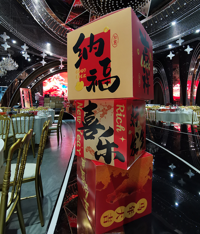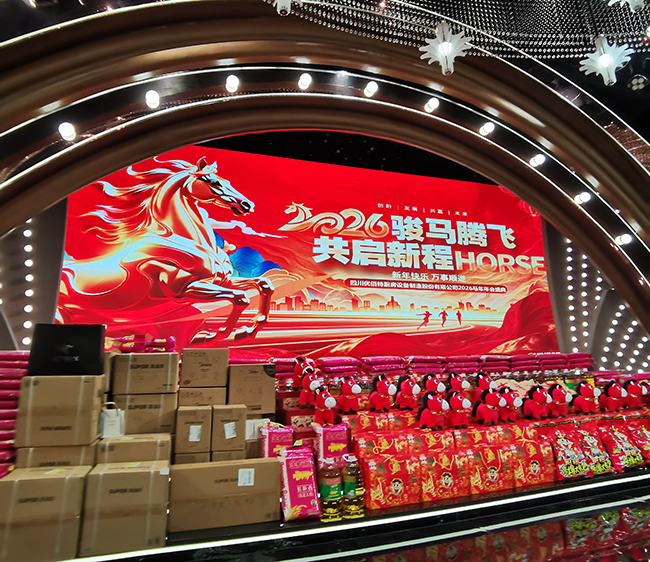 此次年会活动在青白江一家高档酒店大厅内举行,活动现场充满节日喜庆气氛,现场张灯结彩,灯火辉煌,摆满庆祝马年春节的各种吉祥物和标识,舞台上面则堆满在本次年会中即将放发的礼品。